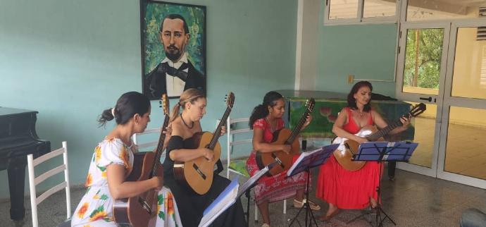 Algo que no pasé por alto fue el hecho de que, cuando Elvira Skourtis presentó a “sus muchachas” (como les dice a las otras tres integrantes del cuarteto) las llamó Maestras: Annia Rodríguez, Yuritza Hechavarría y Leidys Ramos Bicet. Aquel detalle tuvo un motivo dentro del concierto aniversario de Sultasto. A continuación, las Maestras, presentaron a sus alumnos.[1] Es que, además de su trabajo como guitarristas concertistas, cada integrante del cuarteto funge como profesora de la Escuela Profesional de Arte “El Cucalambé”.